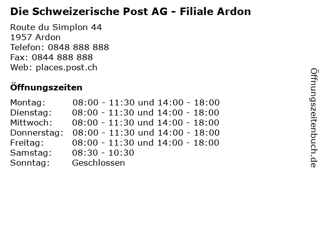 Branchen & Suchbegriffe zu Die Schweizerische Post AG - Filiale Ardon:ardon, briefe, briefmarken, empfangen, frankieren, pakete, post, schweizerische, versenden, zahlungsverkehr |