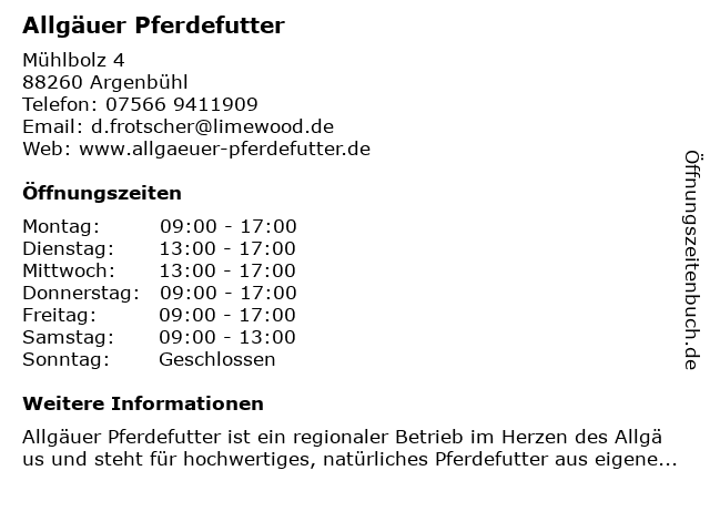 | Öffnungszeiten Allgäuer Pferdefutter in Argenbühl anzeigen | |