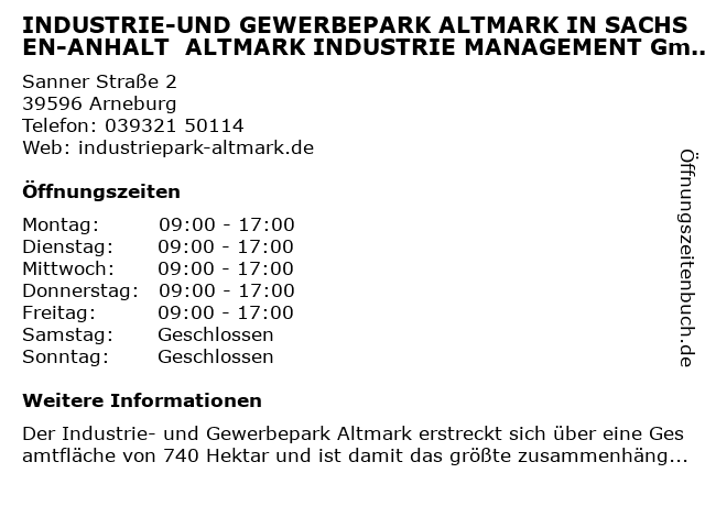 Branchen & Suchbegriffe zu INDUSTRIE-UND GEWERBEPARK ALTMARK IN SACHSEN-ANHALT ALTMARK INDUSTRIE MANAGEMENT GmbH:altmark, anhalt, bürovermietung, gewerbepark, gewerbliche immobilienagentur, immobilienverwaltungsagentur, industrie, investmentservice, management, sachsen |