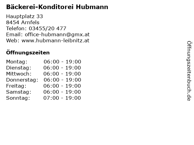 | Öffnungszeiten Bäckerei-Konditorei Hubmann in Arnfels anzeigen | |