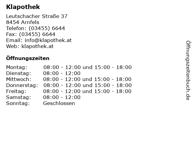 | Öffnungszeiten Klapothek in Arnfels anzeigen | |