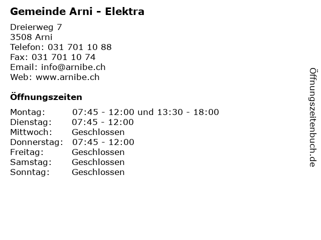| Öffnungszeiten Gemeinde Arni - Elektra in Arni anzeigen | |