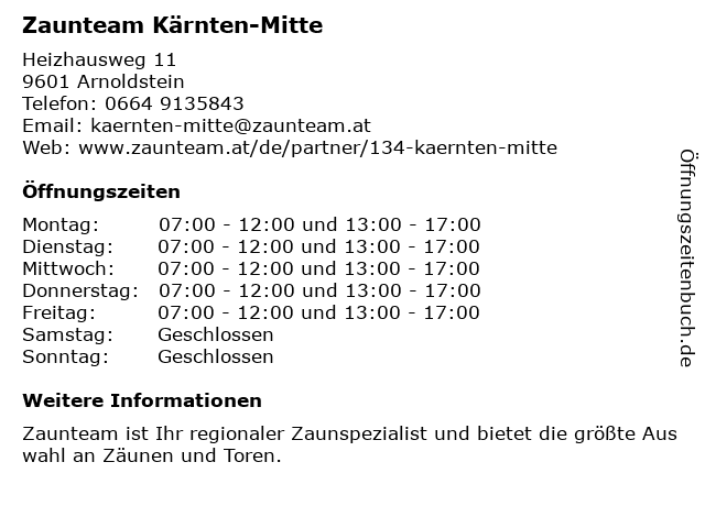 | Öffnungszeiten Zaunteam Kärnten-Mitte in Arnoldstein anzeigen | |