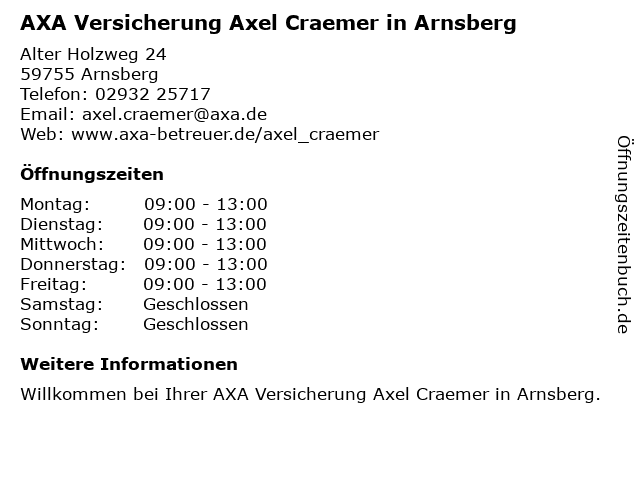 4 AXA & DBV Versicherung Sabanovic & Brillowski OHG Arnsberg (Entfernung: 2,97 km) Heinrich-lübke-straße 15, 59759 Arnsberg 5 JungesGrün Garten- und Landschaftsbau, Dipl. Ing. Axel Junge (Entfernung: 9,10 km) Hochstr. 81, 59846 Sundern 6 Axel Bachtenkirch - Copy-Shop Lendringsen (Entfernung: 10,76 km) Lendringser Hauptstr. 1, 58710 Menden |