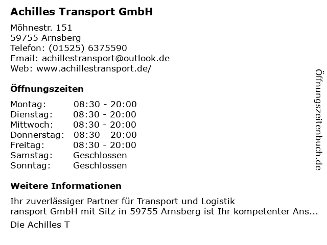 | Öffnungszeiten Achilles Transport GmbH in Arnsberg anzeigen | |