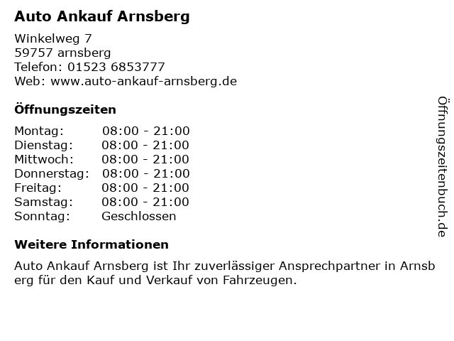 | Öffnungszeiten Auto Ankauf Arnsberg in arnsberg anzeigen | |