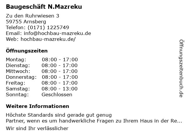 | Öffnungszeiten Baugeschäft N.Mazreku in Arnsberg anzeigen | |