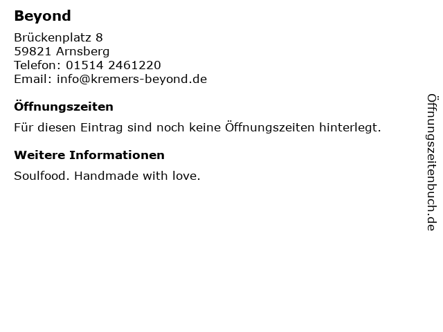 | Öffnungszeiten Beyond in Arnsberg anzeigen | |