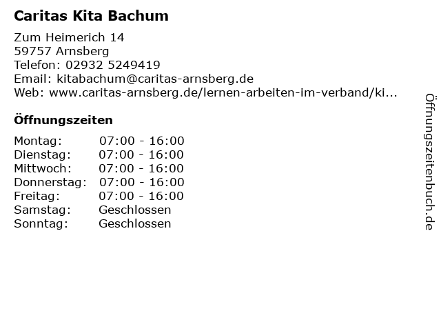 | Öffnungszeiten Caritas Kita Bachum in Arnsberg anzeigen | |