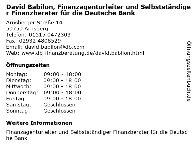 Branchen & Suchbegriffe zu David Babilon, Finanzagenturleiter und Selbstständiger Finanzberater für die Deutsche Bank:babilon, bank, david, deutsche, finanzagenturleiter, finanzberater, selbstständiger |