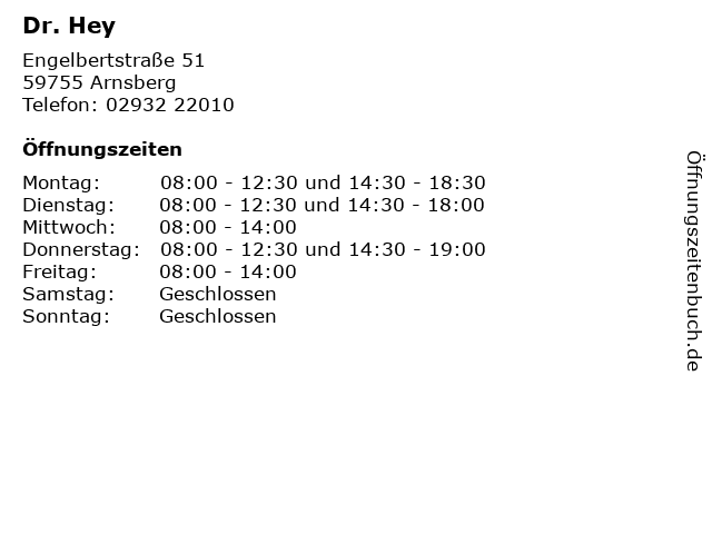 | Öffnungszeiten Dr. Hey in Arnsberg anzeigen | |