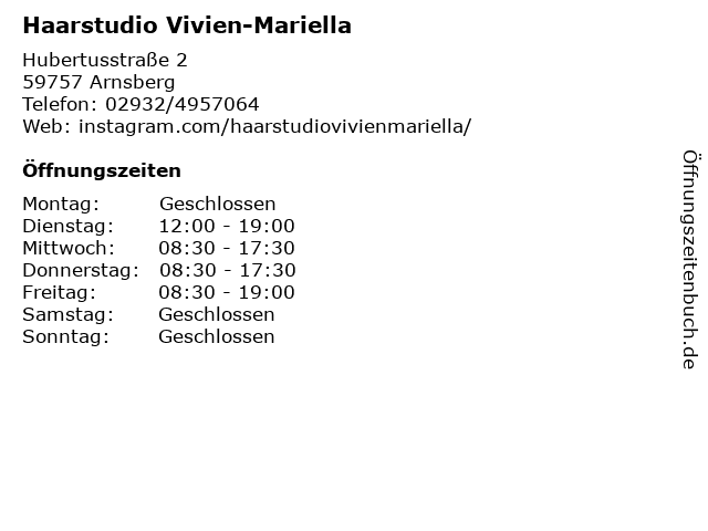 | Öffnungszeiten Haarstudio Vivien-Mariella in Arnsberg anzeigen | |