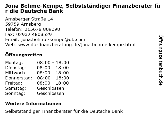 Branchen & Suchbegriffe zu Jona Behme-Kempe, Selbstständiger Finanzberater für die Deutsche Bank:bank, behme, deutsche, finanzberater, jona, kempe, selbstständiger |