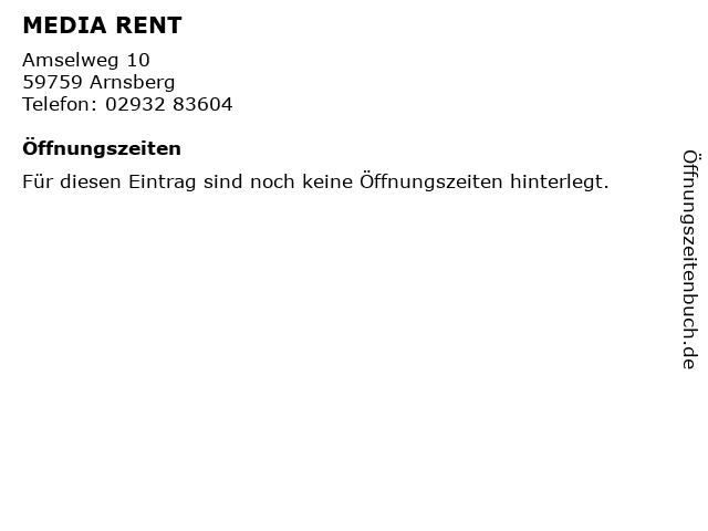 | Öffnungszeiten MEDIA RENT in Arnsberg anzeigen | |