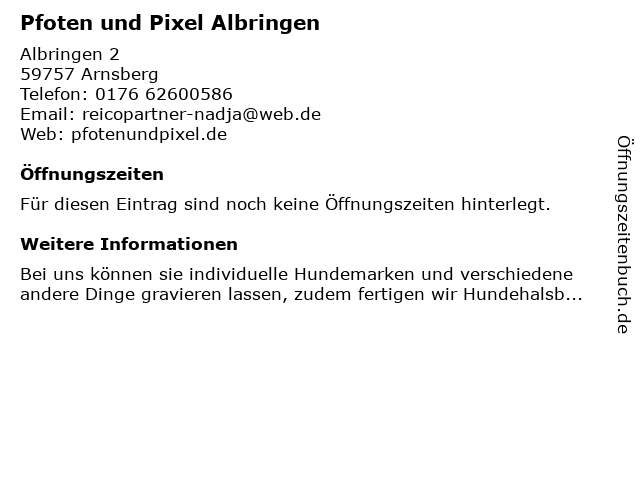 | Adresse Pfoten und Pixel Albringen in Arnsberg anzeigen |