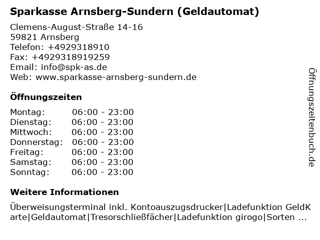 1 3 Sparkasse Mitten im Sauerland (Geldautomat) (Entfernung: 6,28 km) Heinrich-Lübke-Straße 10, 59759 Arnsberg 4 6 Sparkasse Mitten im Sauerland (Geldautomat) (Entfernung: 8,32 km) Westenfelder Straße 29, 59846 Sundern |