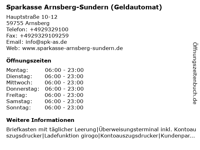 1 3 Sparkasse Mitten im Sauerland (Geldautomat) (Entfernung: 3,54 km) Heinrich-Lübke-Straße 10, 59759 Arnsberg 4 5 6 Sparkasse Mitten im Sauerland (Geldautomat) (Entfernung: 9,71 km) Clemens-August-Straße 14-16, 59821 Arnsberg |