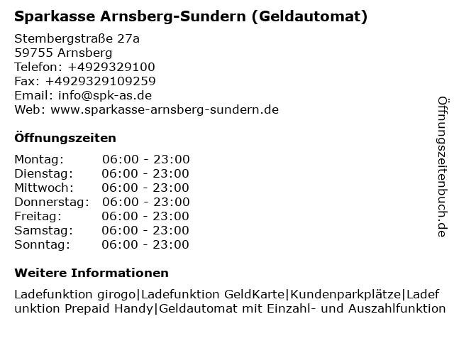 2 Sparkasse Mitten im Sauerland (Geldautomat) (Entfernung: 2,72 km) Heinrich-Lübke-Straße 10, 59759 Arnsberg 4 5 6 Sparkasse Mitten im Sauerland (Geldautomat) (Entfernung: 8,91 km) Clemens-August-Straße 14-16, 59821 Arnsberg |