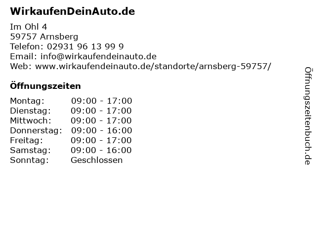 | Öffnungszeiten WirkaufenDeinAuto.de in Arnsberg anzeigen | |