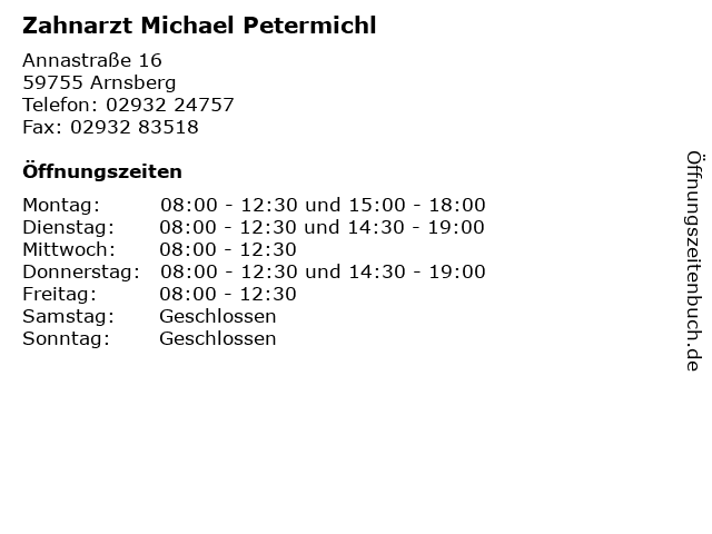| Öffnungszeiten Zahnarzt Michael Petermichl in Arnsberg anzeigen | |