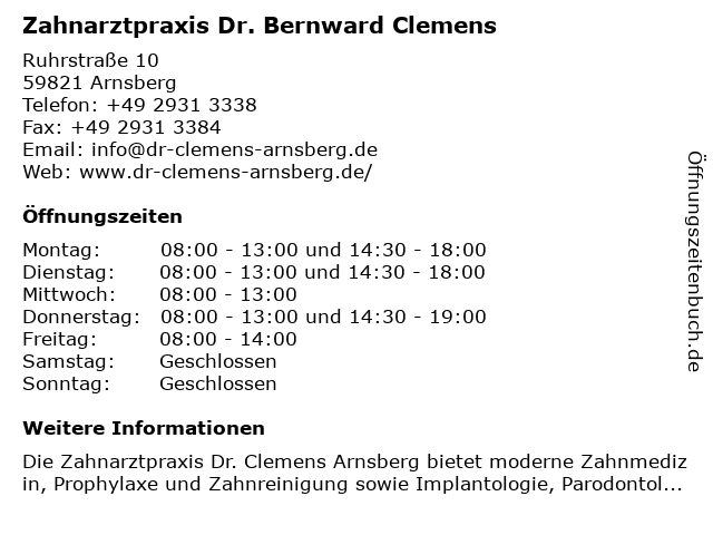 Branchen & Suchbegriffe zu Zahnarztpraxis Dr. Bernward Clemens:angstpatienten, bernward, bleaching, clemens, dr., dr. clemens arnsberg, füllungen, implantologie, kinderzahnheilkunde, parodontologie, prophylaxe, prothetik, wurzelbehandlung, zahnarzt arnsberg, zahnarztpraxis, zahnberatung, zahnchirurgie, zahnersatz, zahnkontrolle, zahnmedizin, zahnreinigung, ästhetische zahnmedizin |