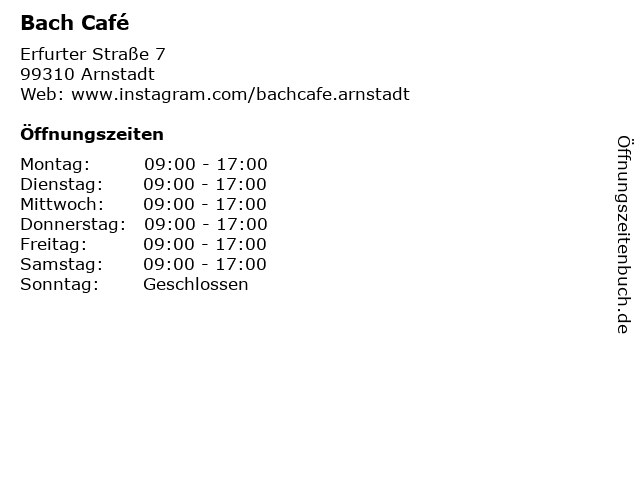 | Öffnungszeiten Bach Café in Arnstadt anzeigen | |