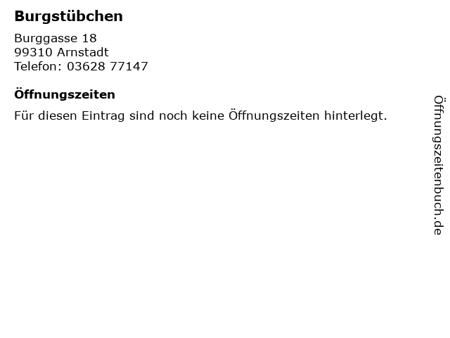 | Öffnungszeiten Burgstübchen in Arnstadt anzeigen | |