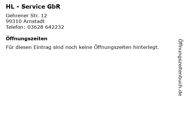 | Öffnungszeiten HL - Service GbR in Arnstadt anzeigen | |