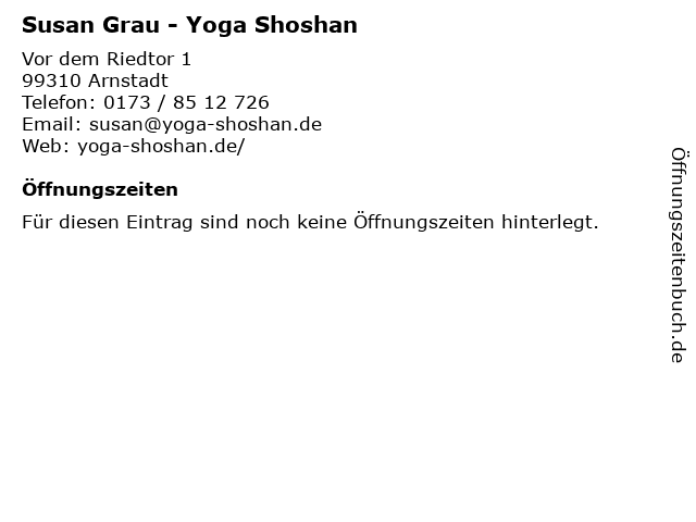 | Öffnungszeiten Susan Grau - Yoga Shoshan in Arnstadt anzeigen | |
