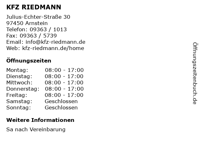| Öffnungszeiten KFZ RIEDMANN in Arnstein anzeigen | |