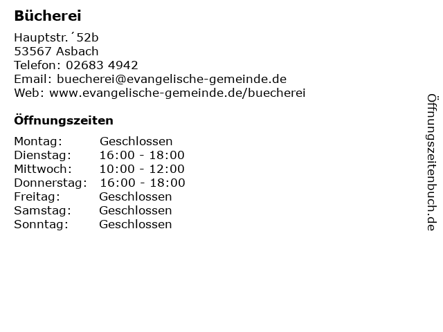 | Öffnungszeiten Bücherei in Asbach anzeigen | |