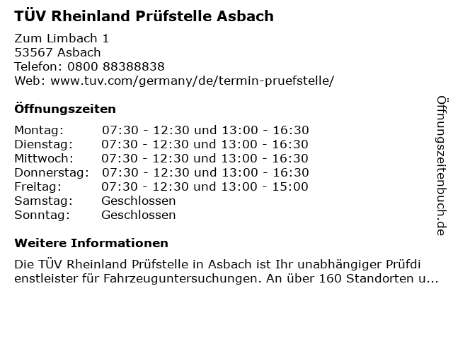 Branchen & Suchbegriffe zu TÜV Rheinland Prüfstelle Asbach:asbach, prüfstelle, rheinland, tüv |