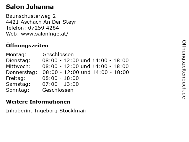 | Öffnungszeiten Salon Johanna in Aschach An Der Steyr anzeigen | |