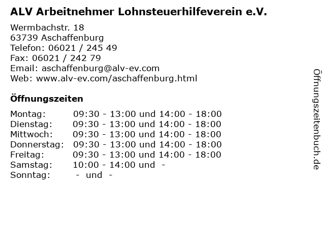 2 Lohnsteuerberatungsverbund e.V. -Lohnsteuerhilfeverein- Frau Susanne Noe. Beratungsstellenleiterin (Entfernung: 0,77 km) Goldbacher Str. 41, 63739 Aschaffenburg 3 Lohnsteuerberatungsverbund e.V. - Lohnsteuerhilfeverein - Beratungsstellenleiterin Sigrid Mieth (Entfernung: 6,58 km) Goethestraße 1, 63867 Johannesberg 6 |
