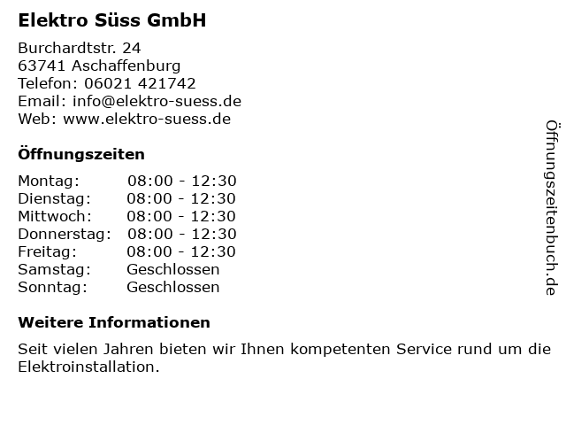 | Öffnungszeiten Elektro Süss GmbH in Aschaffenburg anzeigen | |