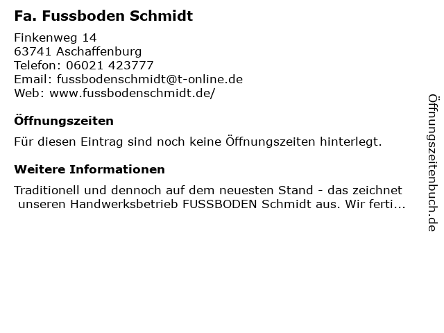 | Öffnungszeiten Fa. Fussboden Schmidt in Aschaffenburg anzeigen | |