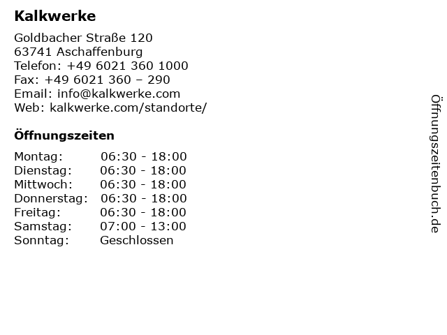 | Öffnungszeiten Kalkwerke in Aschaffenburg anzeigen | |