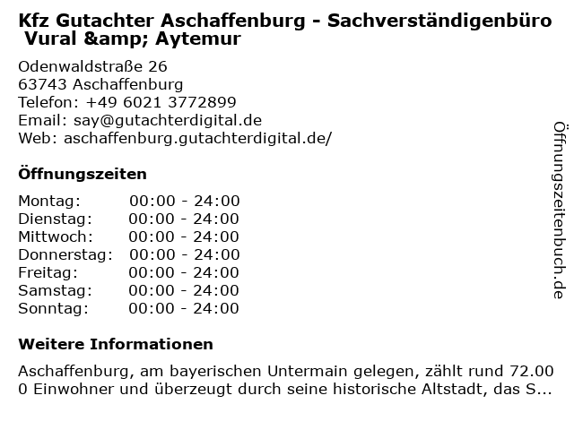 1 KFZ Gutachter Aschaffenburg / Auto-Sachverständiger Wolf (Entfernung: 1,06 km) Bavariastraße 16, 63743 Aschaffenburg 2 VePa IMMOBILIEN - Geprüfte Gutachter und DIN-Zertifizierte Immobilienmakler. (Entfernung: 1,62 km) Sandgasse 23, 63739 Aschaffenburg 6 |