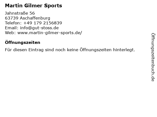 | Öffnungszeiten Martin Gilmer Sports in Aschaffenburg anzeigen | |