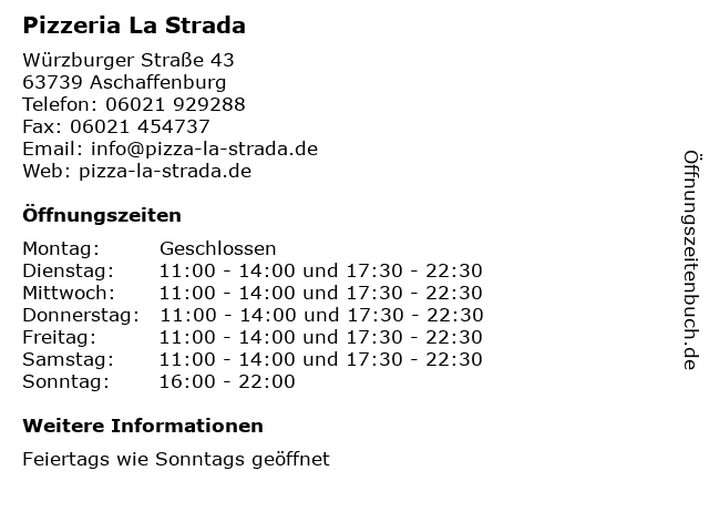| Öffnungszeiten Pizzeria La Strada in Aschaffenburg anzeigen | |