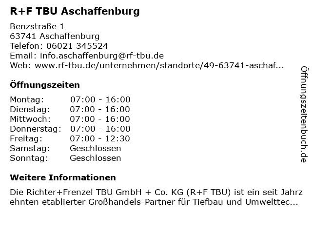 | Öffnungszeiten R+F TBU Aschaffenburg in Aschaffenburg anzeigen | |