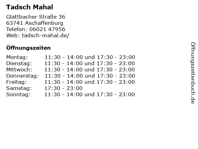 | Öffnungszeiten Tadsch Mahal in Aschaffenburg anzeigen | |