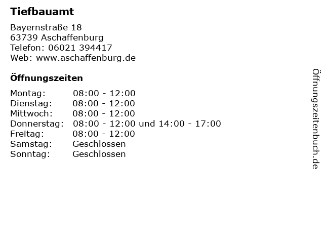 | Öffnungszeiten Tiefbauamt in Aschaffenburg anzeigen | |