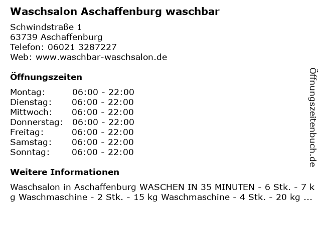 1 Waschsalon WASCHHAUS mit Bügelservice und Änderungsschneiderei (Entfernung: 1,59 km) Schneidmühlweg 48, 63741 Aschaffenburg 6 |
