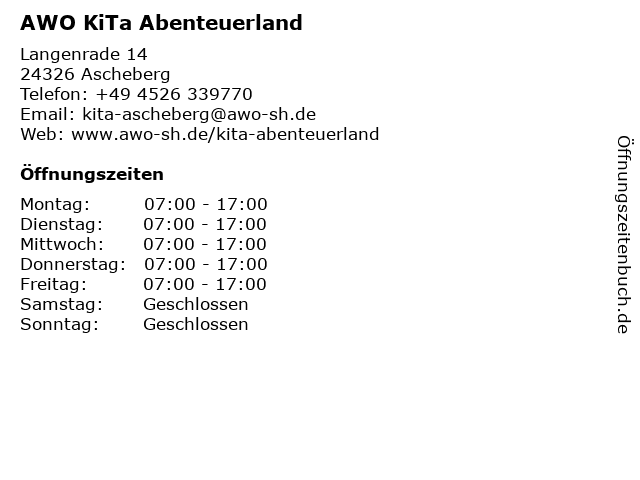 | Öffnungszeiten AWO KiTa Abenteuerland in Ascheberg anzeigen | |