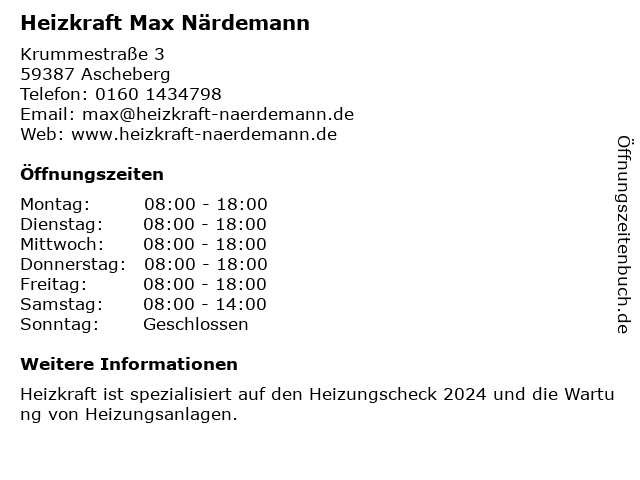 | Öffnungszeiten Heizkraft Max Närdemann in Ascheberg anzeigen | |