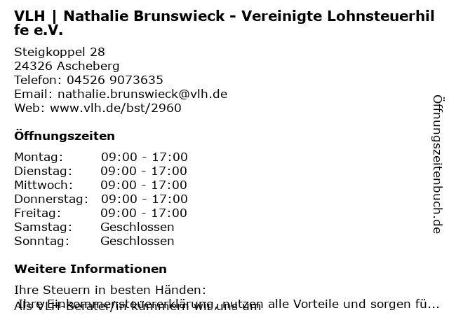 Branchen & Suchbegriffe zu VLH | Nathalie Brunswieck - Vereinigte Lohnsteuerhilfe e.V.:brunswieck, e.v., lohnsteuerhilfe, nathalie, vereinigte, vlh |