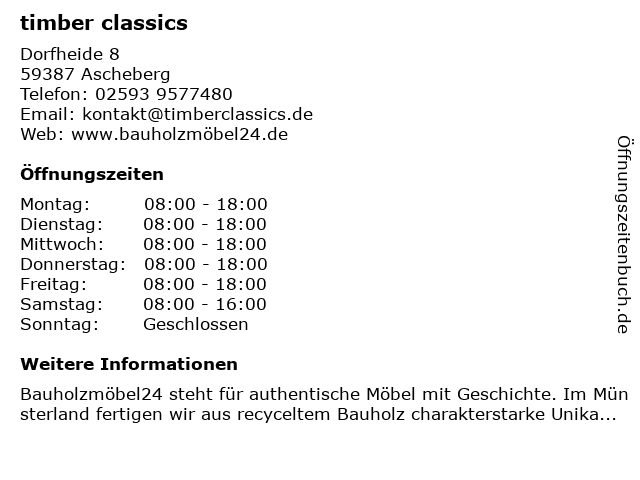 | Öffnungszeiten timber classics in Ascheberg anzeigen | |