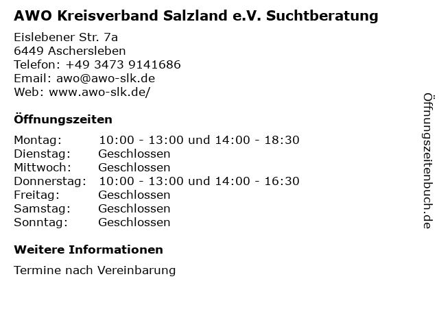 Branchen & Suchbegriffe zu AWO Kreisverband Salzland e.V. Suchtberatung:awo, drogenberatung, e.v., essstörungen, kreisverband, medikamente, salzland, substitution, suchtberatung |