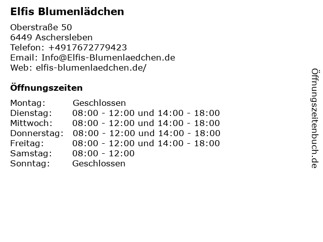 | Öffnungszeiten Elfis Blumenlädchen in Aschersleben anzeigen | |